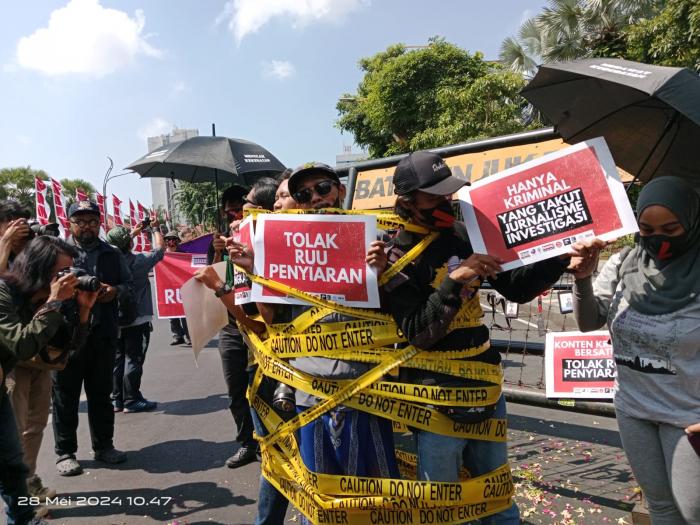 Aksi penolakan RUU Penyiaran yang diselenggarakan di Taman Apsari Surabaya, pada Selasa (28/05/2024). Aksi ini dilakukan pada pukul 10.30-11:00 WIB dan dihadiri oleh 9 elemen pers serta organisasi pers mahasiswa. Massa aksi demonstrasi menyatakan penolakan terhadap RUU Penyiaran karena RUU tersebut mengancam kebebasan pers dan bidang media informasi.