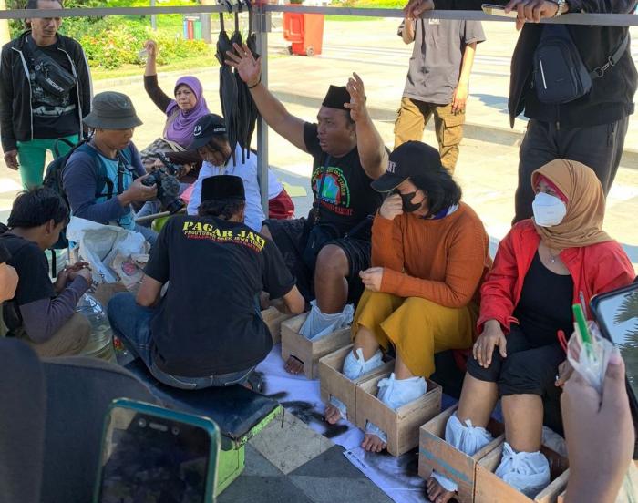Aksi Cor Kaki sebagai wujud solidaritas bagi warga rumah susun sederhana sewa (rusunawa) Gunungsari diselenggarakan di depan Gedung Negara Grahadi pada Kamis (06/06/2024). Aksi ini melayangkan tuntutan kepada Pemerintah Provinsi Jawa Timur yang dinilai mengabaikan hak warga rusunawa akan tempat tinggal yang layak. Aksi ini diikuti oleh berbagai elemen masyarakat yang menyayangkan tindakan pemerintah dalam pengusiran paksa warga Rusunawa Gunungsari.
